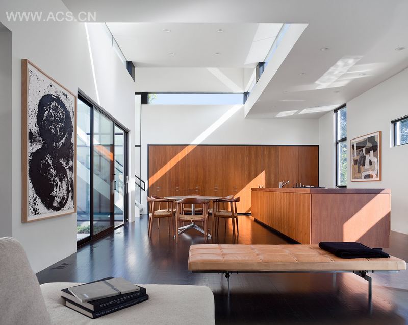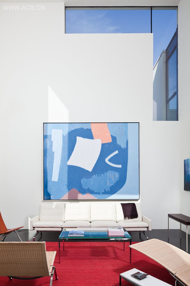 对内部和外部墙体的整修是相同的。穿过玻璃之后灰泥板外墙转变成了石膏内墙。对天窗玻璃和窗户的安装设计者进行了仔细的位置选择,以便居住者赏景或远眺时能为他们提供良好私密性。