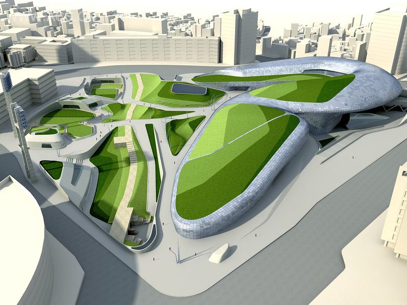 东大门设计广场及公园项目由Zaha Hadid Architects设计,所在地原为举办高中棒球赛的东大门运动场,项目整合了东大门的历史及文化,将现存建筑及周遭的城市环境融为一体。内有博物馆、展览室、常设服装表演场、设计实验室、创意市场和东大门历史文化公园,延续了扎哈的流线风格。文化公园则旨在绿化市区,并把战时被摧毁的城墙等文化遗迹修复。扎哈认为,本案的设计手法可称为“Metonymic Landscape ”(转喻地景),诠释了她对天然景观与建筑设计和谐融合的理念,以流动的自由形体,遥指汉江的蜿蜒,联系首尔周边的南山、北汉山、骆山等。建筑采用碳铝复合金属板打造外壳,配以高强化玻璃纤维水泥,造就其流转曲折的外型。