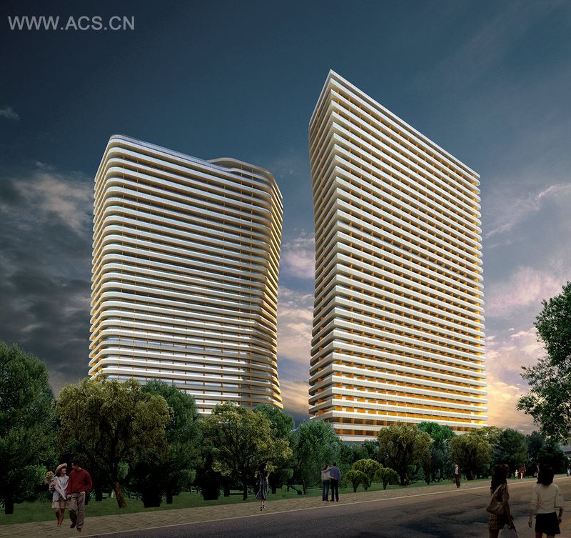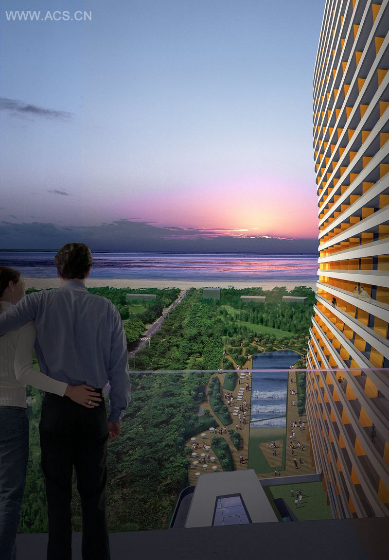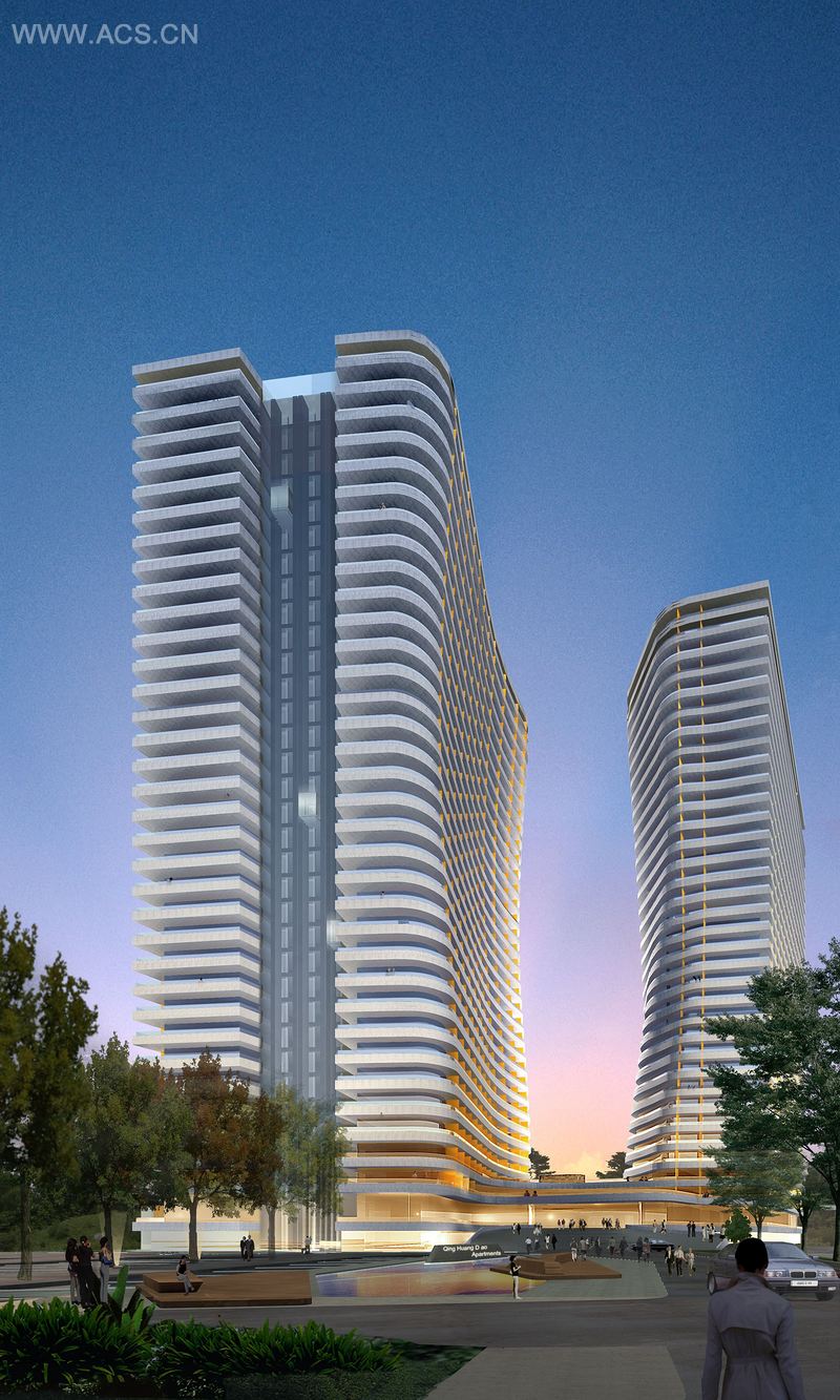 2007 年,一辆高速列车的开通,为秦皇岛周围的海岸线带来了便利,去往北京也只需 40 分钟。预计秦皇岛未来的角色,将成为首都的私家海滨,随之的居住空间需求和酒店面积也面临飞涨。在一个双塔式的项目内 , 秦皇岛国际公寓将提供 100,000 平方米的酒店式公寓单元和酒店设施,如餐馆、水疗中心、酒吧和连同一个婚礼小教堂的会议设施。该设计在两座塔楼之间创建了一个动态张力带。对立于外立面的弯曲孔径,类似于光滑的侵蚀岩石或女性身体的轮廓。曲线在剖面显示小交替变化的地板上盘子的悬臂深度。阳台上安置了琥珀色的磨砂玻璃,选择性地接收早晚的外部光线,并为大厦的不同角度赋予不同的色彩。