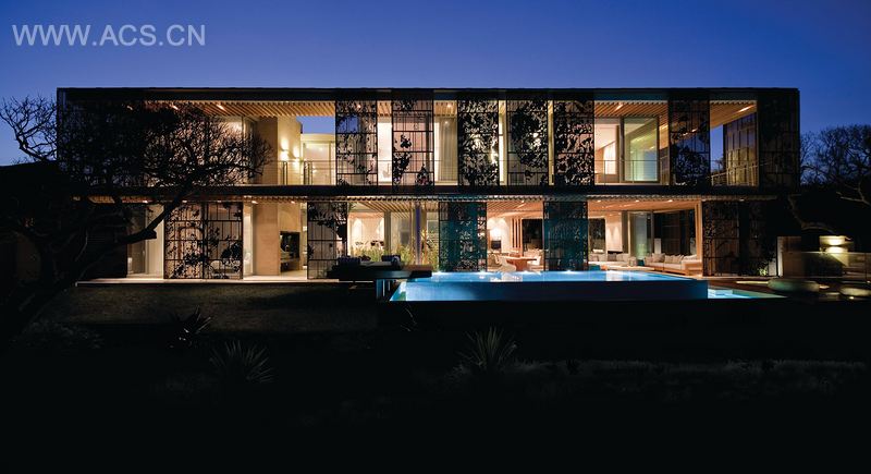 不定的环境条件需要采取一种能在留有景观的同时保证室内外空间流动性的方法。因此房屋的前部外观被一系列古铜色的电镀铝屏覆盖,像蚕茧一样包住全部或部分结构。虽然这层铝屏最初的设计目的是起到保护作用,但它也是整个房屋中最动人的特色,充分展示了由乳木树而获得灵感的平面设计创造。当铝屏幕完全关闭时,乳木树的全貌便非常巧妙地呈现出来。此外,楼上的厚板向前伸入低层的露台区域,正好成为另一个屋顶,因此即使门距宽阔,室内空间仍可以享有很大的隐私。