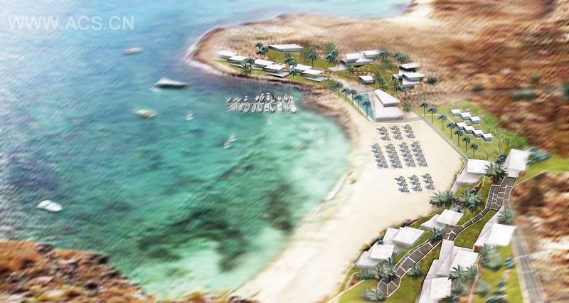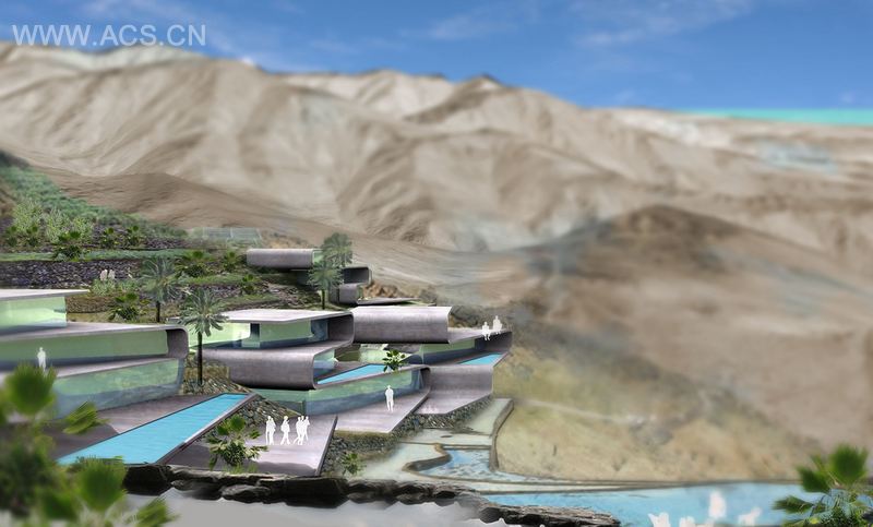 沙漠的概念,即在沙漠中心盖一座“海市蜃楼”,内部环境丰富,如沙子堆成的峡谷和可以遮阴的走廊。星空下是开阔的露天区域,是庆典举办的剧场,也是贝都因传统的胜地。周围的沙丘群是独特的风景线,可以透过私人别墅和豪华小屋观览。Wadi 度假村沿着山谷的缓坡而建。独立的别墅小屋位于泛滥平原之上,潺潺的流水,指引着游客回家的方向。该区域享有瀑布的自然之美;沿着石墙的流水波光粼粼。花园、阴影池及旗下的步道,都别具特色。海湾度假村则是一