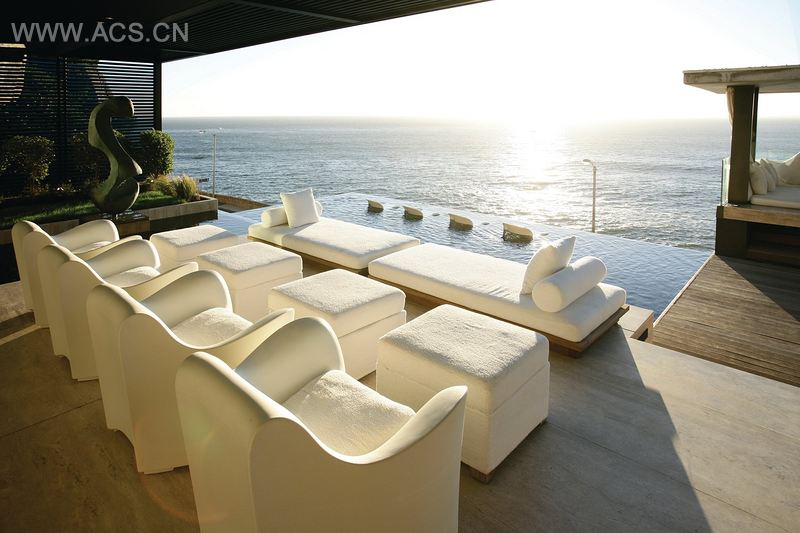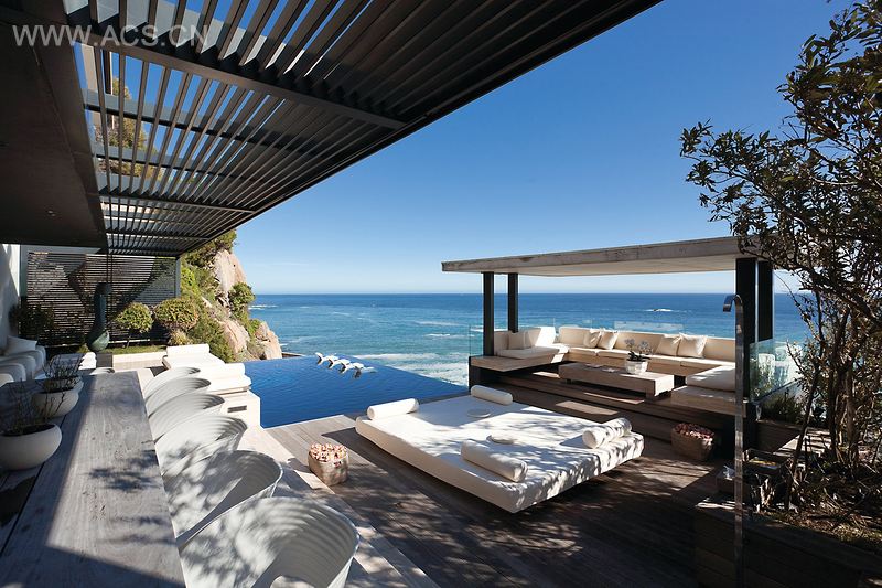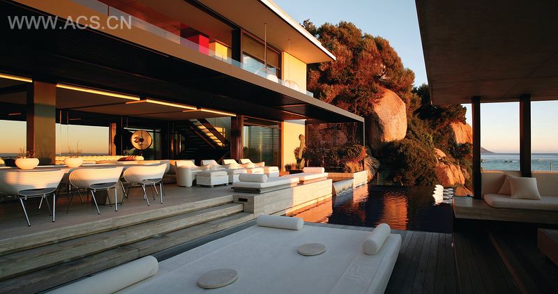 该设计主要为了建造家庭别墅,单个空间里就含有厨房、客厅和餐厅。这些区域能享受到终日的阳光和海景,彷佛定格在画框中。而附近的岩石为这一层增添了特色,并将此层连接到上方的卧室楼层。第二个生活区也是一个给人深刻印象的娱乐区,它位于下一层,上方是家庭聚居楼层,客户可以在这与一大群朋友休闲娱乐。有泳池的露台使得有屋顶和无屋顶的区域都能围泳池放松休憩。带有一个宽敞吧厅的娱乐休息室靠近室外烤肉野餐区。极好的观景台位于休闲甲板的西部边缘,允许主人在休闲甲板边缘享受日落的最后时刻。