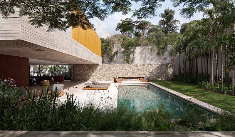 住宅在结构上进行大跨度,除了能营造出完全自由而延展的空间外,还强调了“漂浮的盒子”这一理念。将原始混凝土用于现代建筑,就像与现代建筑的一次对话,充满美感并具功能性。住宅Ipês以其结构上的大跨度和粗粝材料的使用,展现出一种清醒而节制的态度。经由时间洗礼的混凝土也静静诠释着建筑生命的曾经。