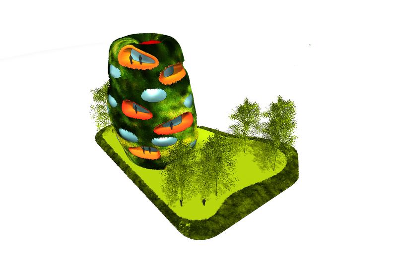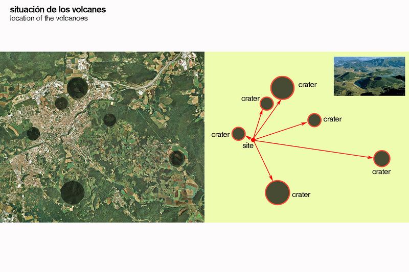 新的会议酒店和餐馆从 Garrotxa 火山带的心脏“浮现”。客房围绕着一个“红”的核心放射排列,就像一个火山口。它们贯穿了整座建筑,直到外部,因此也提供了垂直照明。就像是休眠火山区域,外立面上覆盖着植被,只被球面玻璃窗户和拥有露台的房间打断。作为一个拥有接待区的酒店,它的会议大厅被设在了半地下室区域,仅略低于餐厅,直接通向街道,以及它的大型活动露台。