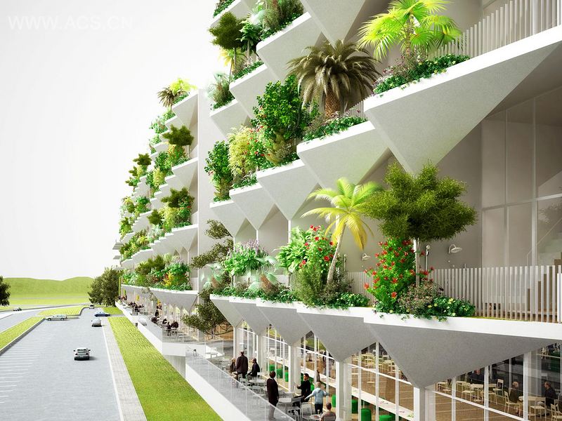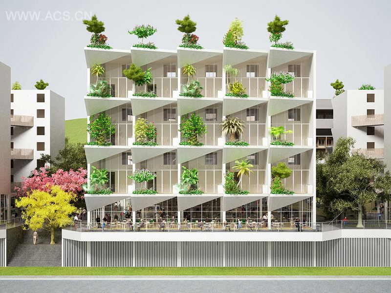 酒店套房的结构别出心裁。套间的结构由两层组成。故而营造了突出的拓展空间: 现可提供两层高的空间,居住环境宽敞舒适。两层高的复式房一直延伸到外围:顶级阳台随之出现,私密而宽敞。阳台可用作室外起居室。我们可以大胆想象,将会有露天厨房。配有淋浴喷头的热水浴缸将与阳台并肩而立。酒店的特色在于其每间房都有巨大的三角形“花盆”。总之,它们营造了一种富有韵律感与动感的风格。枝繁叶茂的花草树木旨在增强隐秘性,伴随着晾阴与酷爽,大自然的情怀将怀里徜徉。或许这也形成了微观生态链。