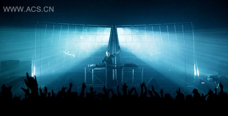 受到迪斯科闪光球原理的启发,“V镜”舞台由2块反射并发光的翅膀型面板所组成。这个结构设计让电子乐手Vitalic在舞台中间看起来像是一只将要起飞的昆虫。