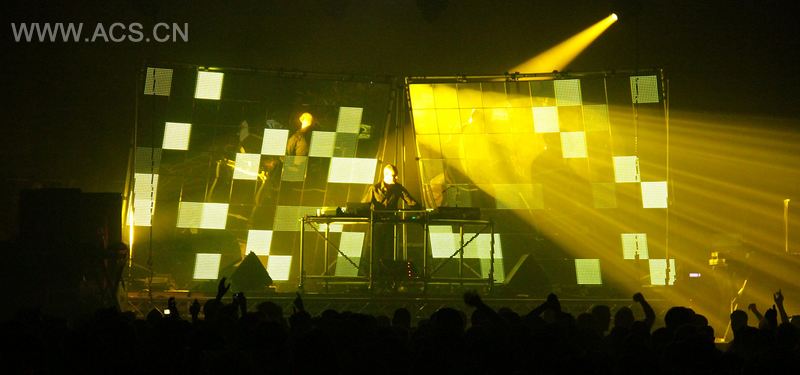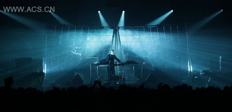 “V镜”舞台由覆盖了一层透明及反光的太阳能黏合保护膜的LED面板组成。