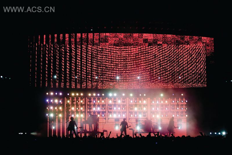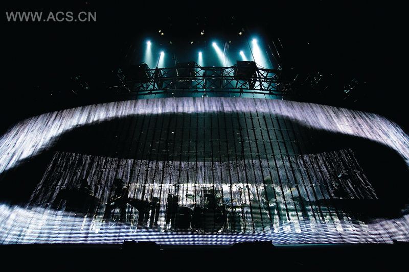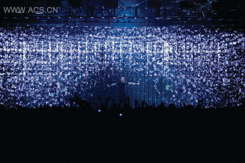 时刻工厂的这个创新互动式设计让九寸钉能监测演唱会进程,并实时形成内容。舞台上的一个装置能根据巨大的透明LED隐形屏幕上所呈现的的多端现场捕捉输入数据及现场画面而做出反应。利用它们的XMS(延伸存储器规格)平台,时刻工厂创造了一个创新的演出环境,它能承受住摇滚乐巡回演出的严格标准。