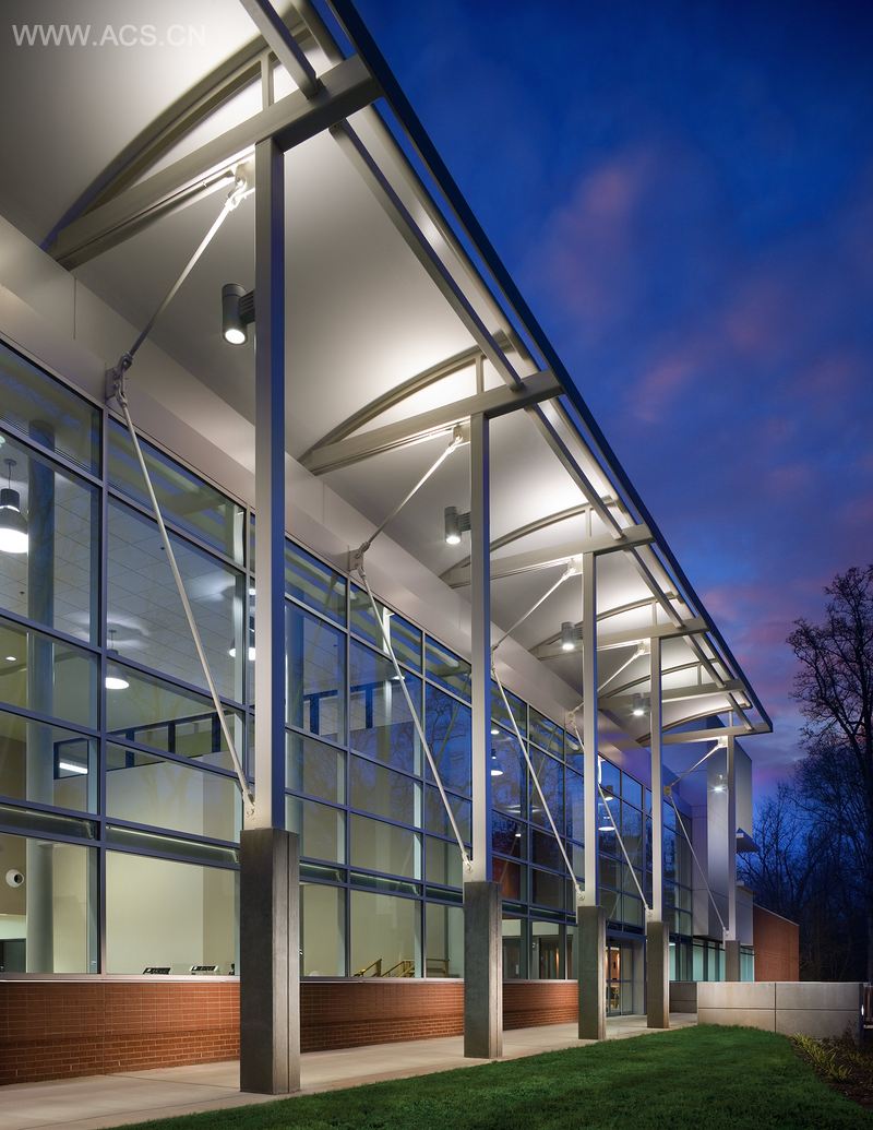 该设计把外表面与现有建筑同色的灰泥和砖换成了钢和玻璃。同面积的两层入口大厅取代了原来校园建筑的大厅。门廊和柱廊还保留着,但已用现代工业材料重新塑造。这些设计变化体现了当代修复学和矫正学的技术,活塞式钢棒和可拉伸的植物网格雨棚,而模拟活动部件与有弹性的碳纤维和玻璃纤维材料则通常用于制造假肢。