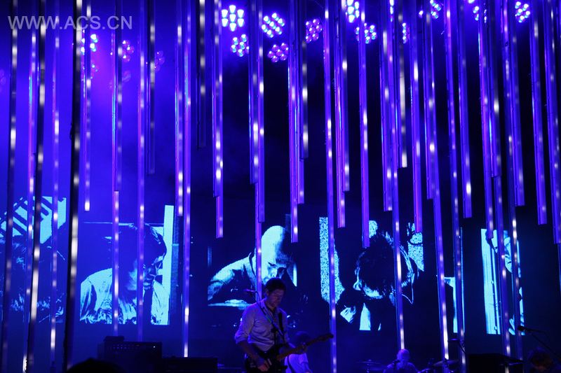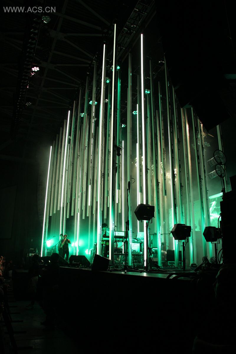 摇滚乐队“电台司令”的“彩虹里”巡回演唱会的舞台设计顺应了乐队希望减少全球巡演带来的环境冲击影响。设计团队决定只采用节能型最佳的的灯光设备,整个舞台仅仅由LED灯组成,中心围绕了72条由LED管做成的垂直柱子,它们被排列成精准的阵列,创造了一个三维显示屏。舞台区域被可操控光线的坚固台柱所填满,乐队在被灯管阵列所切断的区域中表演,与整个空间形成了一种牵连感。使用定制软件,其2D和3D的录像影像能呈现在屏幕上,同时3D图像能主导整个表演的内部空间。除此以外,静止及移动的LED灯给乐队和观众提供了灯光。乐队表演被多个摄相机的镜头所捕捉,极其个性化的现场录像呈现在舞台后面的3D阵列区中一个极其宽阔的LED立体屏幕之上。第一次将所有的LED技术运用在一个重大的世界巡回演出之中,这个设计获得了全世界的认可。从环保的角度看,这个设计将灯光及影像所需的用电量降低了接近75%。