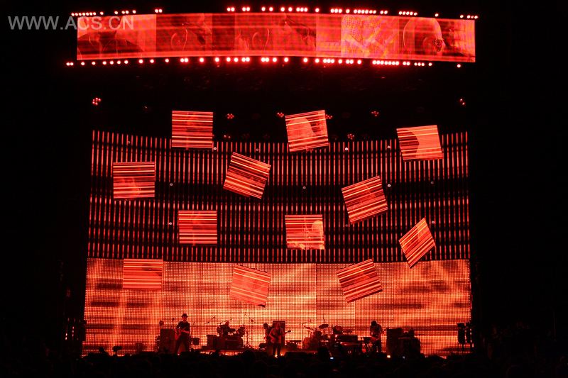 2012电台司令巡回演出需要一个既能在大型室内舞台中使用,又能在体育馆及大型户外节日中派上用场的舞台设计解决方案。这个舞台再次采用了全LED设备的设计,而且是一个十分影像化的解决方案。多个远程操作摄像机用于捕捉乐队表演的影像,它们能够现场直播并用作于四个主要显示面的材料。第一个是17 x 2米的曲面标头银屏,其上下方都有LED的观众席灯光。第二层表面是由12个2 x 2米的屏幕所组成的,每个屏幕都被4条钢绞线悬挂着在空中飘荡,它们与运动控制系统相连,也能360º地旋转。“傀儡”屏幕不断地在表演过程中移动和重排它们自己的位置。第三层表面是一个在舞台后部的LED灯管曲面墙,与此同时,它的前面是一面专门定制的LED水瓶内壁。这块水瓶内壁尺寸为18 x 4米,由14400个100%循环利用的塑料果汁瓶所组成,它们内部都各自有一个定制设计的LED节点,共同创造出一块240 x 60像素的LED墙。最终的这个设计具有高度的灵活性,为乐队所要求的表演创造了一个美丽的动态联觉结局方案。