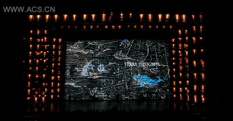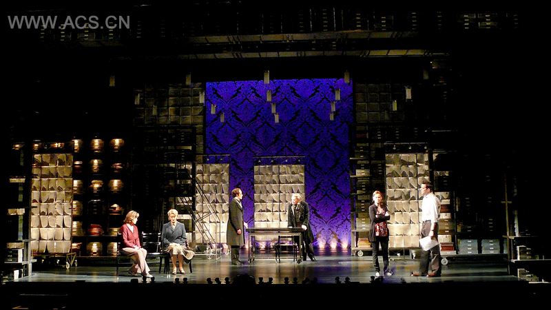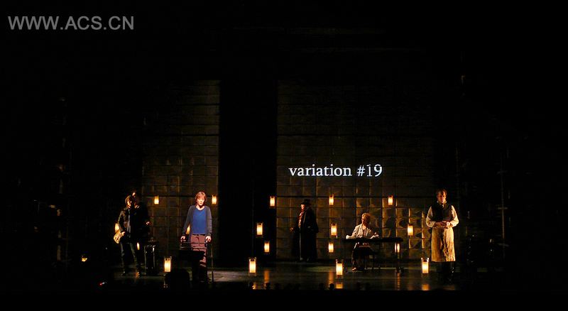 布景元素是箱架子,上面集聚了上千个箱子。围绕它们的是由上百张乐谱纸片做成的大型滑墙 —— 全都是贝多芬的临摹手稿。整个空间的舞台背景是一块半透明的背景幕布,这块幕布的花样以18世纪织锦的放大化细节作为基础。
