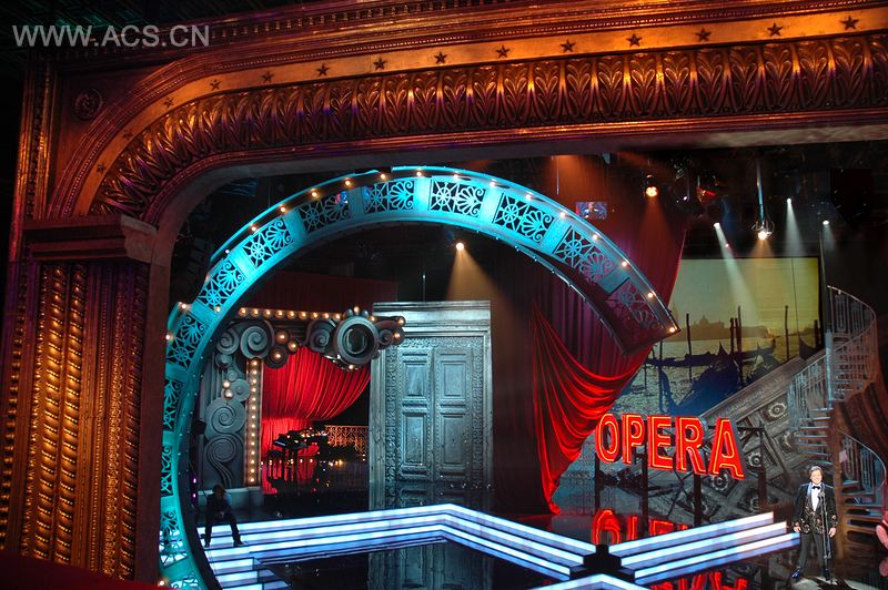 《流行歌手歌剧梦》是一档在黄金时间播出的真人秀节目,流行歌手们在这个节目里要学唱歌剧。这个节目在电视演播室里拍摄,其舞台的概念就是设计出一个类似于填满了折衷混合戏剧布景的歌剧院表演空间。这个节目需要3个表演区、1个观众区以及1个管弦乐队区。整个舞台设计充满了不同的材质和颜色,给观众们提供了一个多角度和多视觉的环境。这种效果营造出一个有趣而丰富的戏剧世界,它能根据每周的不同表演而转变。