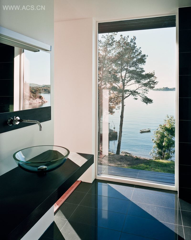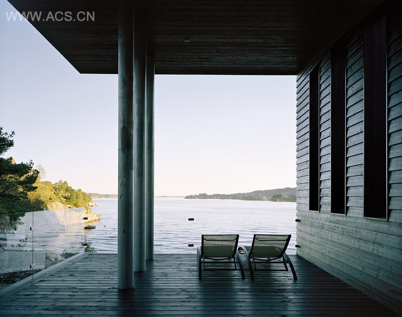住宅有两层,呈细长条状,后方的主入口直通往楼上,一侧有一个悬臂式阳台,阳台足有6米长,由三根钢柱支撑。房屋面向着南面的海,站在阳台上时,可以看到南面和西面绝佳的景色。阳台上有屋顶,可以抵挡卑尔根最恶劣的气候,并且这套住宅通过特别设计,可以避免阳光的暴晒,看起来也颇有格调。二楼是父母的住处,一楼则为孩子们上大学时回家而准备,还有一间35平方米的小客房。