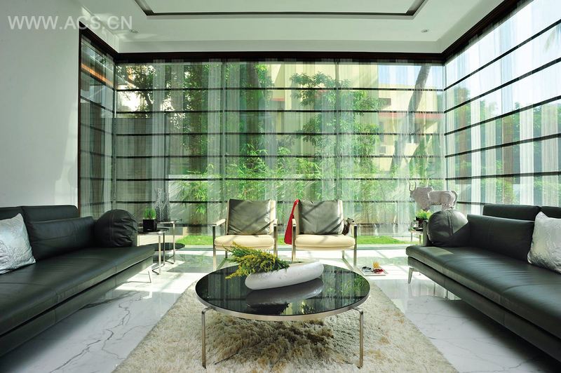 这套住宅最引人注目的部分是它所在的地盘,周围环境比建筑更抢眼。灰棕色大理石与镶嵌的彩绘玻璃使得建筑外观颇有趣,而且自然地融入了周边环境。这套两层住宅占地5 500平方英尺,外观简单而优雅,有着大大的落地窗,业主能透过窗户看到外面郁郁葱葱的美景。室内设计则精致而现代。