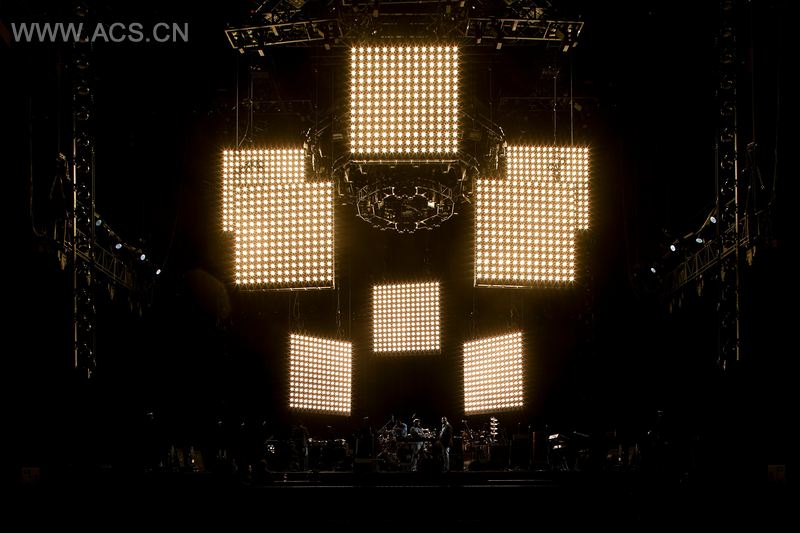 这个被扩大的图标是一个具有多功能用途的立体形状设计,它既是灯光面板的一部分,又是高清显示屏的一部分。在这个设计的正下方是一块同样形状的八面型LED面板,它照亮了乐队,并能根据乐队成员的动作而做出改变。