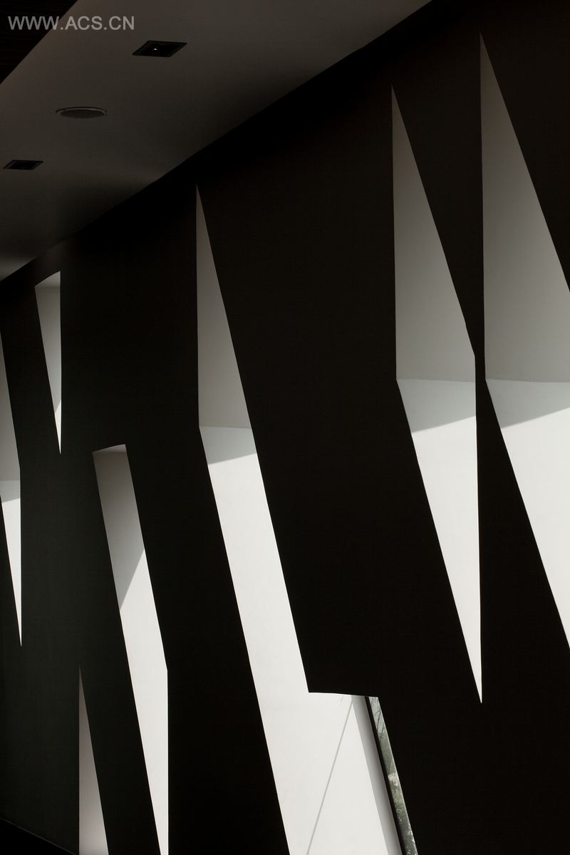 特有的接待厅、办公室和样板间组合成一个像巧克力盒的空间——长30m,宽1 0m,想去创造一个非常简单并有挑战性的建筑物,通过把大跨径箱提升至足够高的位置让人们可以从低处的空间直通高处。支撑主体的结构处于中心,与通往接待中心入口的楼梯连通,这使得楼层两边都拉高了12米。平衡结构就像是一艘宇宙飞船着陆时缓缓放下它的梯子。入口处还有一个透明的圆柱管,既可以让自然光照射进室内,又可以连接楼层的阳台与长廊。