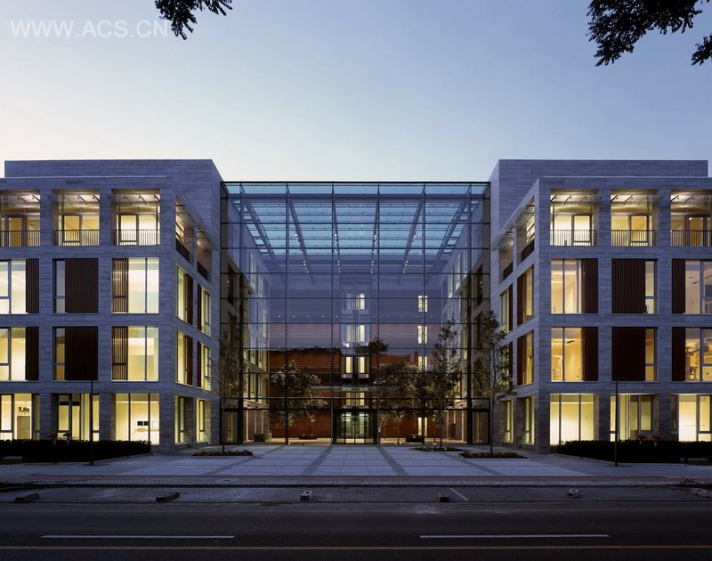 这座新H型建筑物的柱梁表面涂有少量石灰。红色铝在大玻璃表面前形成的影子给古典的外观增添了额外的结构,赋予建筑独特的外观。
