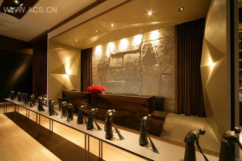 整个空间内选用的灯具令人印象深刻,每一件都象艺术品,把唯美的造型与照明的功能完整地结合在一起。其中有一组灯具象一群大雁在林间飞舞,此建案诉求沈稳、大器、书香之重要,布局时无不以此为前曕之首要。在水瀑之构思~希望带入原有之设计理想,更希望带入水、自然、原始之意境,希望在有限空间内设计发挥之淋离尽至,设计之初由一堆一叠慢慢营造出原本结合灯具之设计,除了照明外更希望让大雁像落雁般散落于本设计案中,故在大雁飞舞中,群雁飞入了水瀑,进而散布于各区域、在卫生间的入口也以有颜色的(蓝色和红色)落雁分男厕和女厕相之呼应。