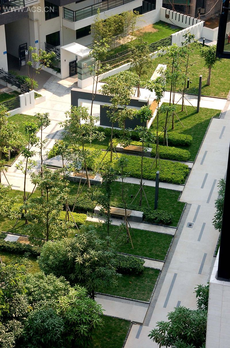 本方案着重于表现亚热带风情园林景观,同时加入现代元素,一流畅的线条和简练的直线构图,组成功能明确的景观空间,使整体布局赋予理性,又包含激情。贯通东西向的水系景观作为景观轴,统一整个小区的设计。在中心景观空间的设计上,运用了动与静、开放与私密、现代与野趣的对比,创造出有节奏、有韵律的空间。同时在架空层设计了多出小型水景,使空间变的活跃和丰富。消防通道的设计采用流畅、活拨、自由的曲线构图,并与草坪绿化相结合,使小区道路变的丰富而有趣,居民可尽情地拥有和享受这个洋溢着现代气息的舒适空间。
