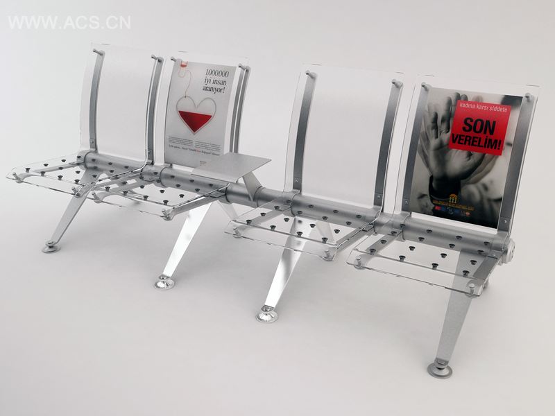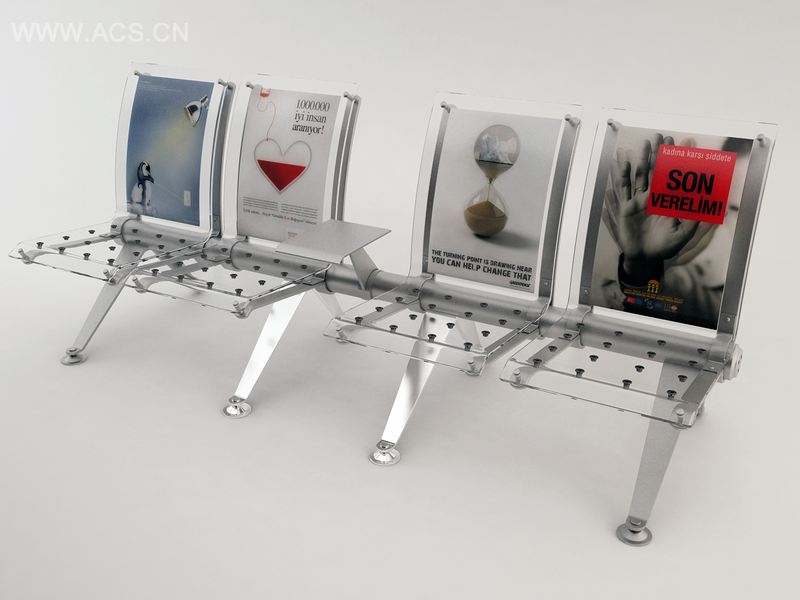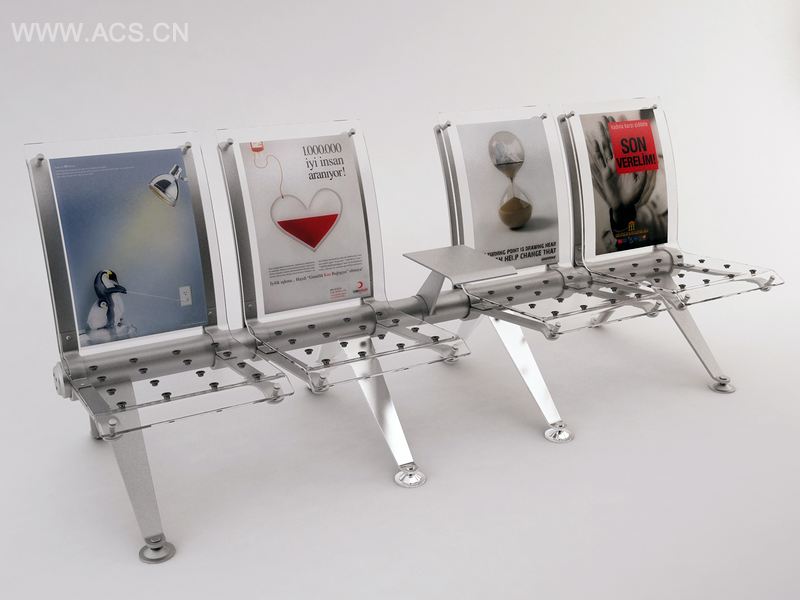 本案是一组室内座椅,有着独特的优势,并且自成一处信息窗口。得益于透明的材质,椅面和椅背面板的中间可以插入广告海报,不仅吸引坐着的人的注意力,而且也牢牢地抓住路人的视线。双层的玻璃面板中间留有插入海报的空隙,能够很方便地替换不同的海报。因此本案不仅仅是一个绝佳的广告窗口,并且也是一个相当不错的信息窗口和标识图样。
