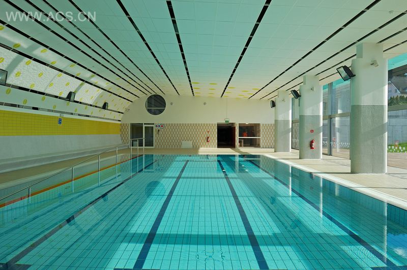 在外部,综合体是整齐的翼型的半透明玻璃相互连接构成的。巨型白色静音条状玻璃和亮色窗帘矗立在稳固的建筑基础上。裙楼通过中庭和外部空间连接起来。裙楼外部根据其功用不同也进行了区分。该建筑体的侧面较为狭长,游泳池的入口朝南,即局部凹陷的木质露台可让您享受日光浴。大健身房的窗户朝北而开,而小健身房坐南朝北。