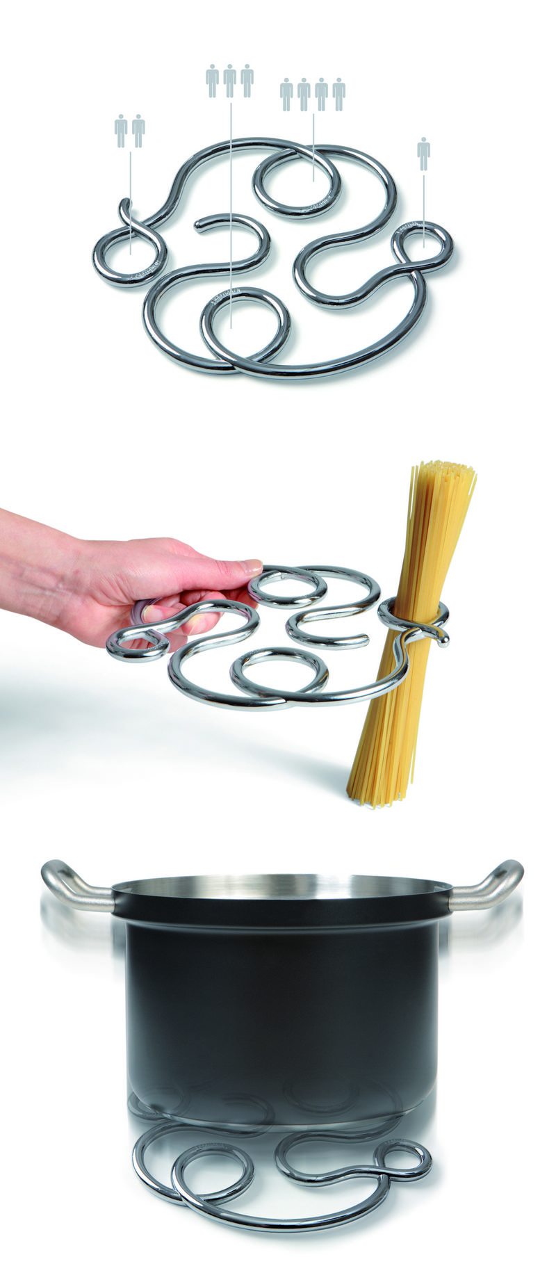 noooodle以一个有趣的办法融合两种功能用途——1-4个圆圈用来计量意大利细粉条;同时整体可以充当焙盘垫。设计灵感来自于意大利细粉条的特征。循环线圈起了4个不同尺寸的计量单位。