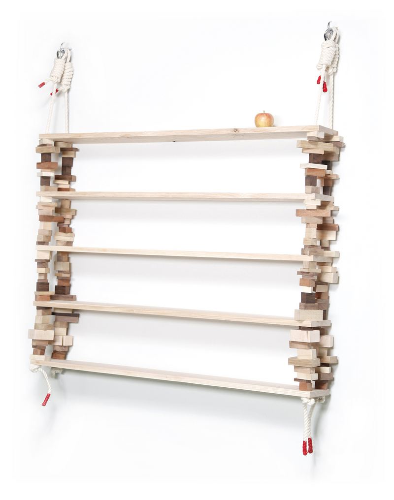 木块架子可以充当隔间架,悬挂在墙上或天花板。它可以组装成4层高,2块木板长的架子;也可以组装成8层高,1块木板长的架子。