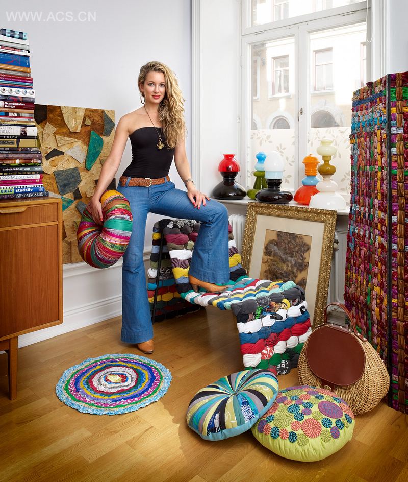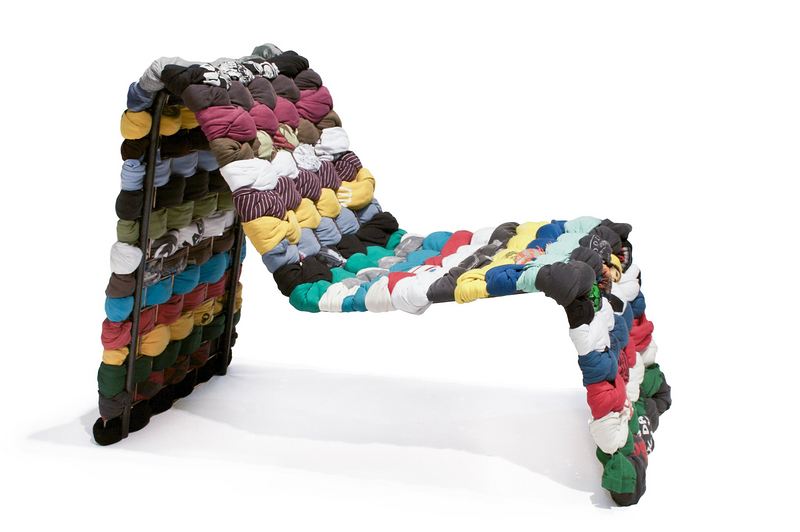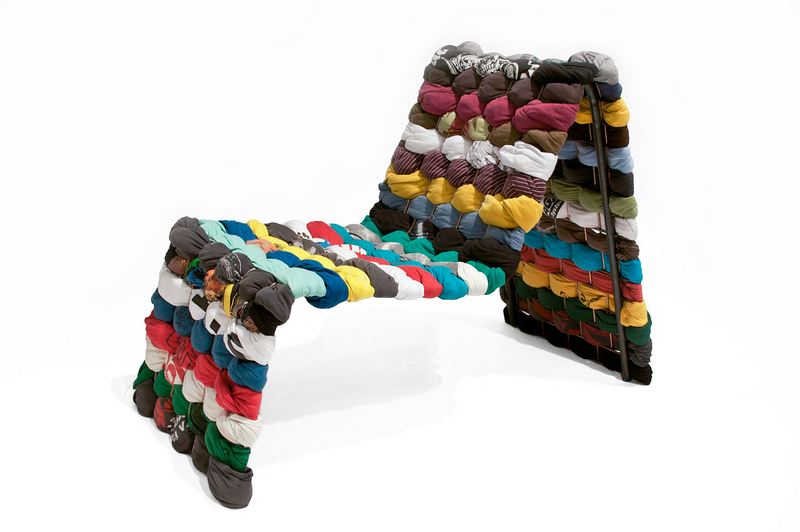 T恤椅就像是一张五彩斑斓的碎呢大地毯。但实际上它是一张由弃用的衣物和地毯拼接而成的简易椅子。每张椅子都有独一无二的色彩和纺织物。可以用穿旧的衣物和周围弃用的布料来取代纺织物。因此,T恤椅也保留下了历史的痕迹。
