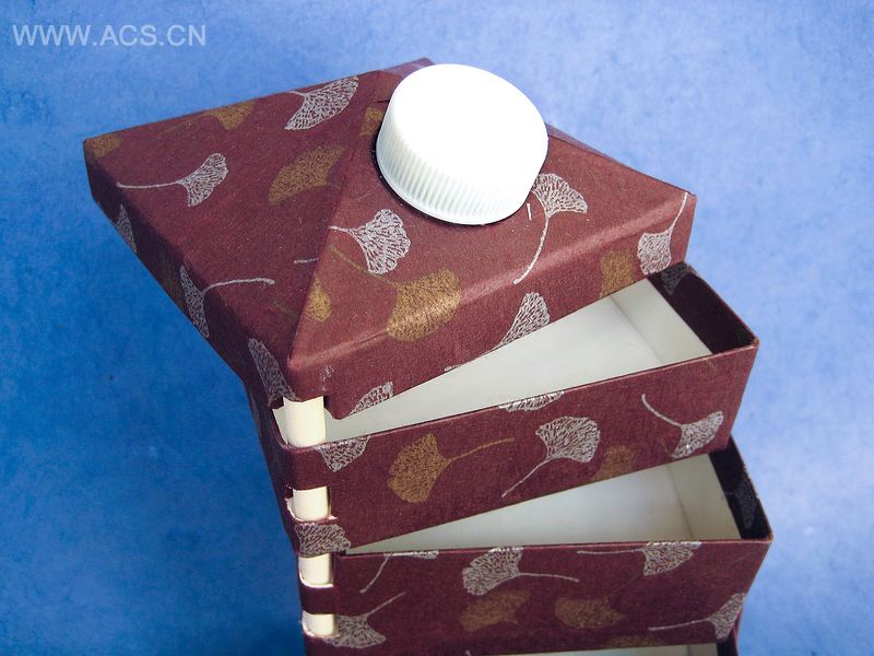 本案是2010年“Desktop单位设计比赛”的最具创意奖得主。来自帕萨迪纳市的Yukie Partos设计师凭借前所未见的全新设计横扫整个赛事。表面看来,这个工艺品是用半加仑奶瓶纸盒做成的原生态作品。但是由于新颖的垂直管串联其各个盒层,每层盒子都能旋转开来,放置物件。作为垂直管的木棍必须非常光滑。我们也可以用没使用过的长铅笔替代。