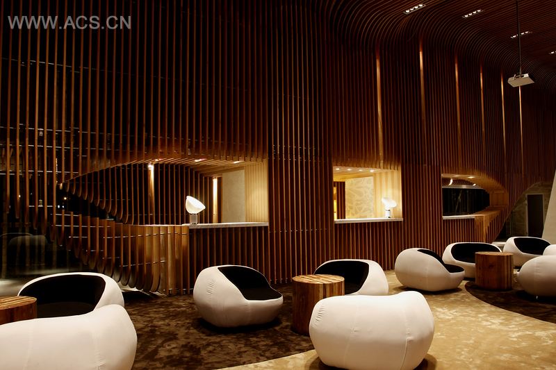 整个空间的塑造上起源于一个有机的形态:海水礁石腐蚀所留下的洞岩痕迹,这个有机的形态,被一个双层表皮所包裹。底层叫做草叶层,是用浅色水泥模板批荡成型墙面,工法之所以用复杂的草叶型态来表现,是隐喻周围茂密的草木地理文脉关系,同时与东方哲学文化内涵所呼应,暗喻一种内敛式的生活方式,顺应自然,人如草叶,一岁一枯荣,就象《菜根谭》所讲,人生如嚼菜根,其实很简单从容、淡定,哲学均在一草一叶之中。上面一层是用了一个比较有韵律感的木质格栅型态的有机体量覆盖整个空间,“朦胧、宁静、律动”,这是我们所表达的空间意象。“朦胧”所赋予空间的是一种东方诗意的婉约美:“烟笼寒水月笼紗”,宁静是一种心态,是一种思索,“律动”是周边大海这一地理文脉所赋予我们的一种水纹的起伏,也是平静中的一种律动和喜悦,不悲不亢,不争不溢,东方的气韵,东方的气象,是我们所追求的一种现代诠释。