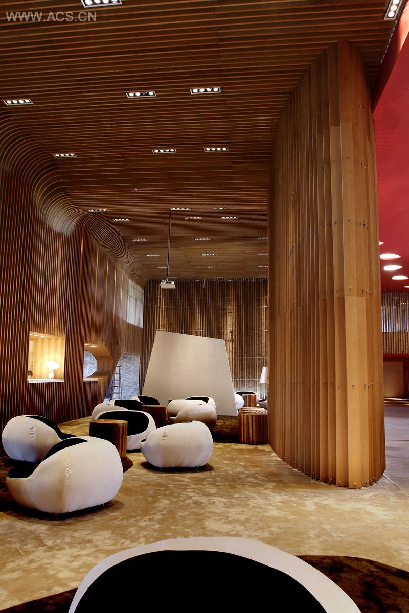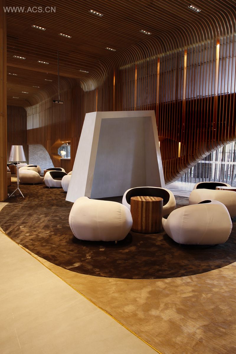 工法技术:从工法技术上,我们在探索的是把传统的建造技术引入室内空间当中,整个空间摈弃粘合剂的应用,全部以结构、节点连接所有形体,也可以说是回归传统的一种室内空间探索吧,包括底层墙壁我们用了灰水泥和白水泥,1︰2的配比,掺入粘合剂,用四块草叶摸板图案,直接于墙面进行了20mm披荡处理,表面处理水泥自流平腊质表层,以还原一种材料真实自然性,形式自然的效果,同时曲面的木质结构符在表面,使图案半隐半现,朦朦胧胧,这所以引用一个律动感的曲面墙体格栅,除了文化底蕴的要求,同时很好的处理了原有土建的管道和结构造成的空间遗憾。