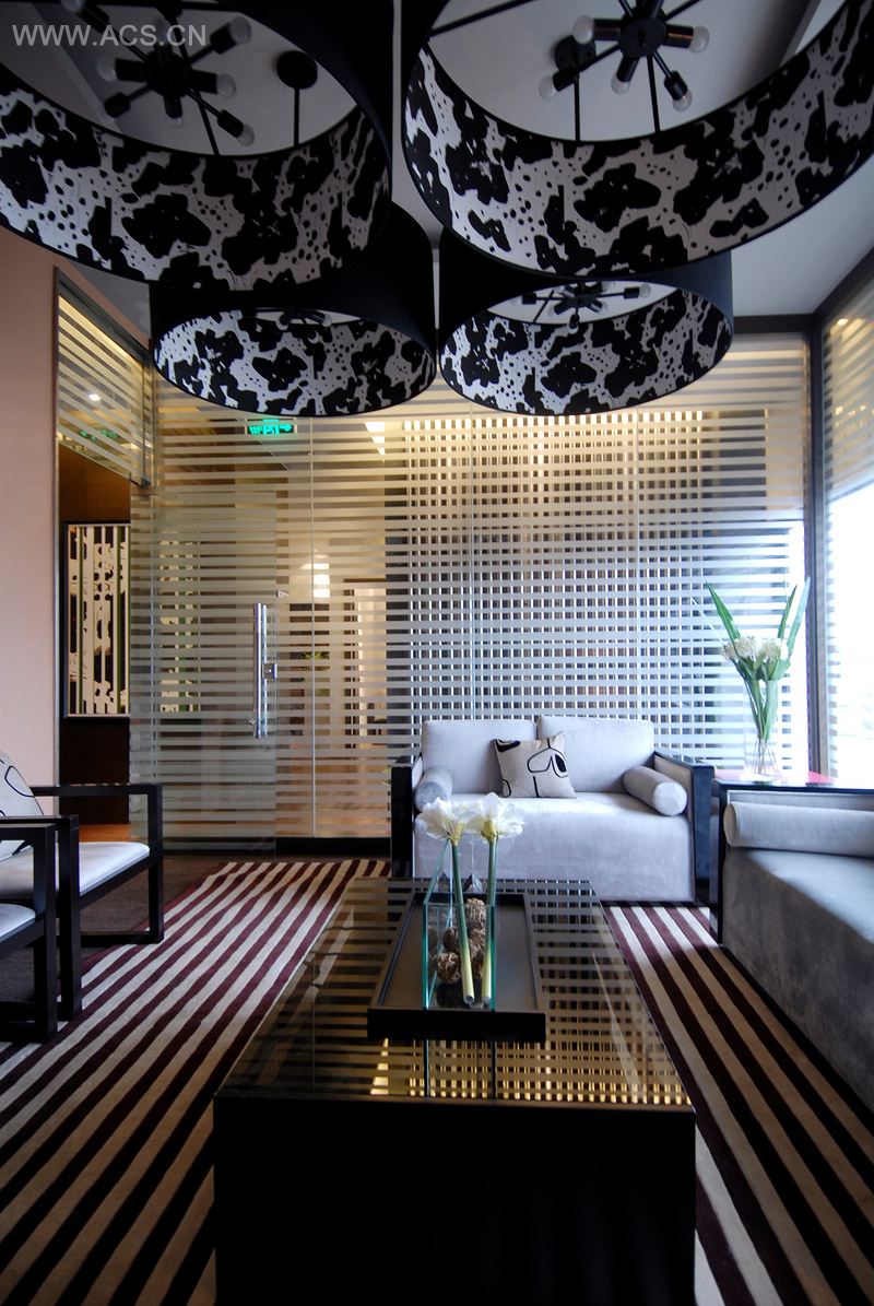 一根根高大坚挺的金属圆柱是变幻后的竹子,带着竹的气息,进一步烘托自然的氛围。设计定做的大型纸吊灯以水墨山涧溪流为题材,黑丝灯罩的外套让它显得幽雅深邃,夜幕中灯光依次照亮,静默的溪流开始缓缓流动,流向每个寂静的角落,让寂寥的夜开始散发生气。