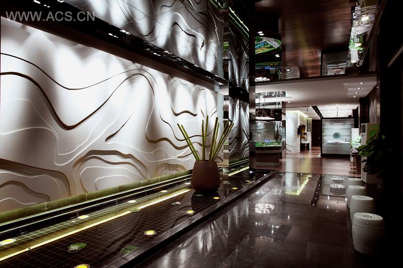 开门即见山体造型背景墙,纯美的柔白色调,线条自由休酣,那一座座“小山峰”,在镜面的承接下绵延不断,绕过一道墙,转到另一面墙,仿似水般柔顺妩媚。主题墙前的小小水池,大缸中的青翠竹筒,缓缓流动的轻轻水声,共同演奏自然的乐章。刚硬的墙柱与天花倒映出“山峰”的柔美曲线,灵动处自成一幅山水美画。