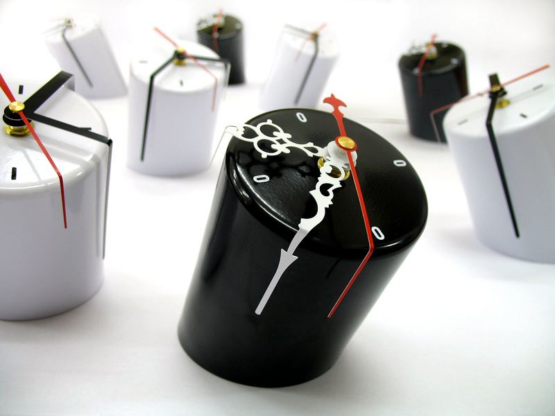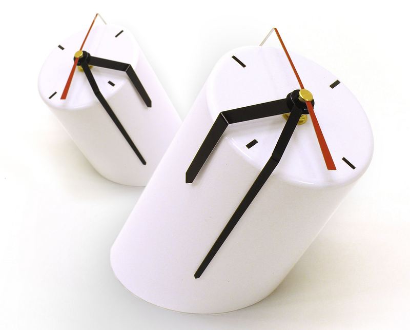 “昼夜不停”是用铝做成的圆柱形钟表,适合放在桌面上。它的独特之处在于圆柱体倾斜了,并且钟面上的指针也是弯曲的。