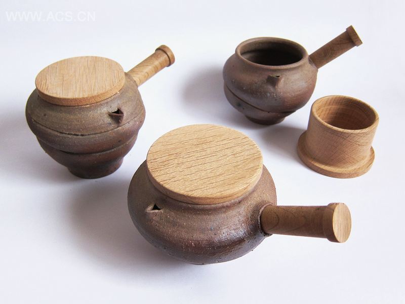 曾有人提出茶壶应该是线条流畅、表面光滑,能够大批量生产的造型。然而,本案却是手工制作、表面粗糙,并且没上釉。这种没上过釉的陶瓷胚体在重复使用后会使茶味显得越发深厚——这就是老茶壶的优点。木质把手越常使用,则越显现其光泽和历史韵味。