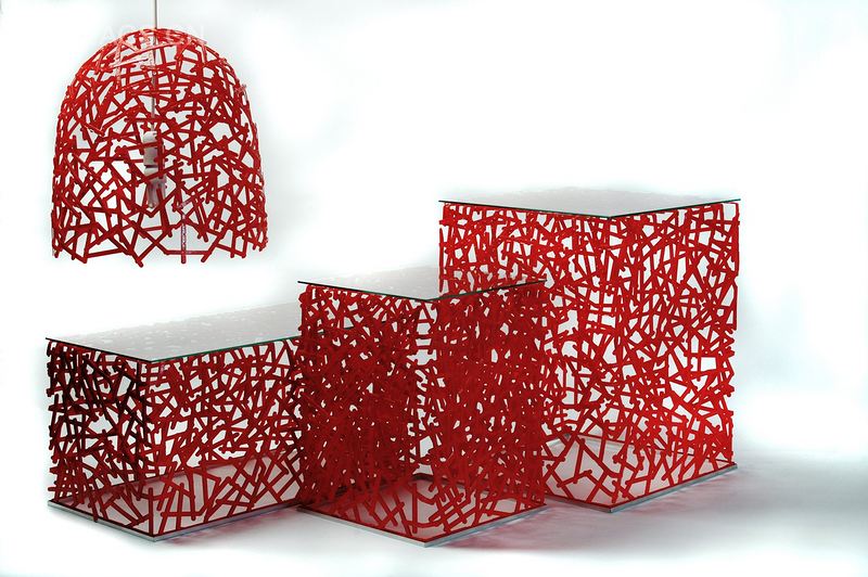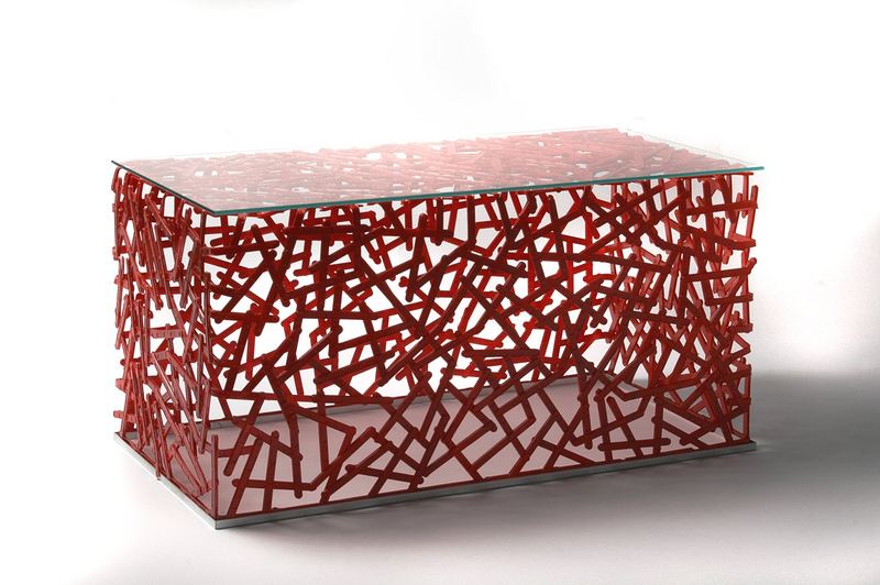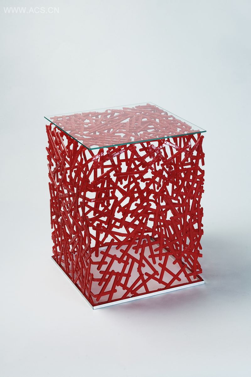 本案用弃用的塑料咖啡勺组装而成。由于这种咖啡勺仅能使用一次,因此每天有上千把咖啡勺面临丢弃的命运。设计师回收资源,创造了一系列“勺子”产品。本案为火红的“勺子桌”。