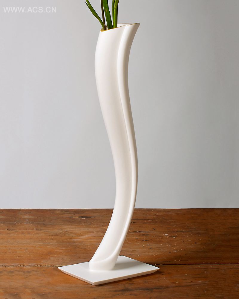 本案细长蜿蜒的造型就像是天鹅的脖子一样优美。当然,“天鹅”花瓶的真正创意并不是天鹅的脖子,只是看起来很像是记忆中的天鹅脖子一样。设计师计划将椅子腿的简洁线条和微弯弧度打造成一个花瓶,最初用树脂抛光处理,其后被改造成抽象的流动线条——这实际上已经成为一个相当优美的装饰品了。完工后在它的边缘处镀以23K的金边,并且打造一个矩形的底板,由此实现了美丽大变身。