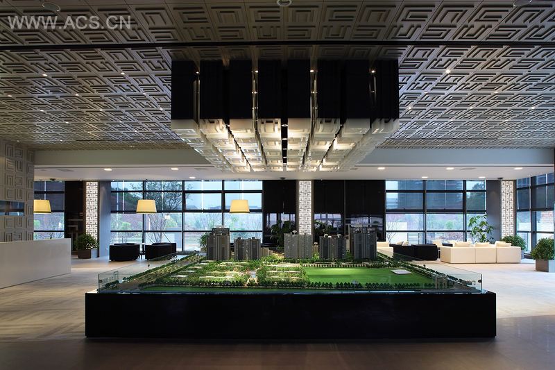 楼盘LOGO作为楼盘特征的一个标识性语言,体现着整个楼盘的风格和气质。设计师巧妙的将这一设计语言运用到空间中,成为本案的一大亮点所在。在主入口处的模型展示区及接待台,整个天花造型,地面,以及接待台背景墙,全部使用楼盘LOGO排列组合成的图案,极富于视觉冲击力,突显了售楼处的气质,从营销角度来看,又加深了客户对楼盘的印象。