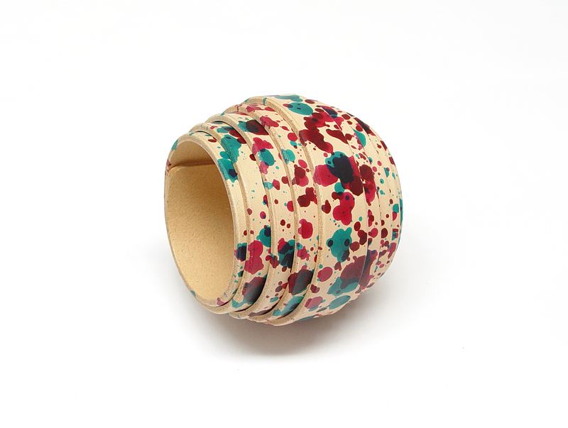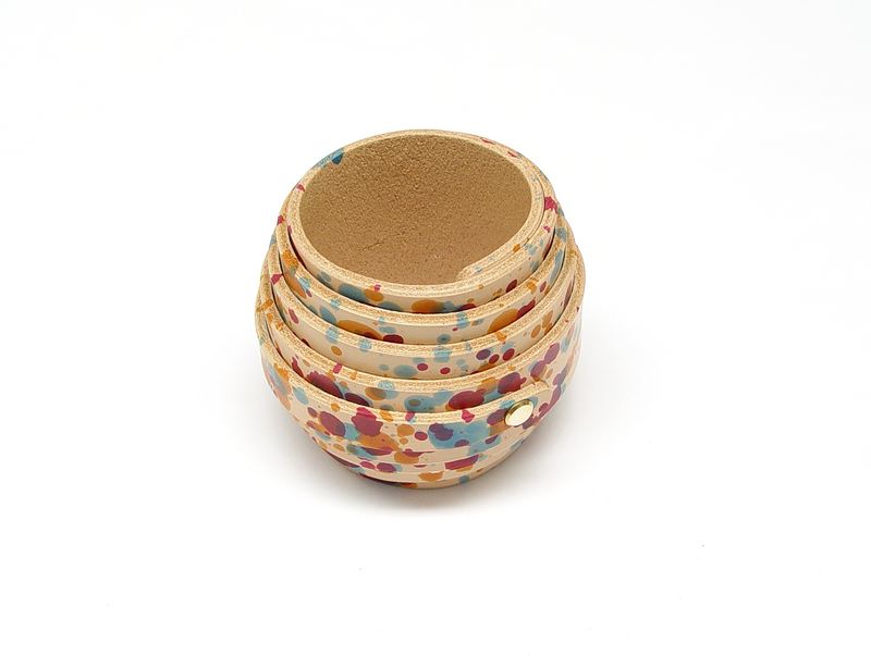 本案用手工染色的皮革做成。将皮革卷起来后,用铆钉固定即可。有多种颜色可供选择。