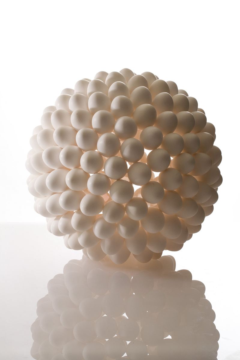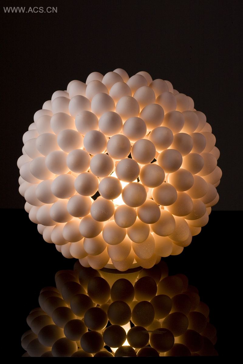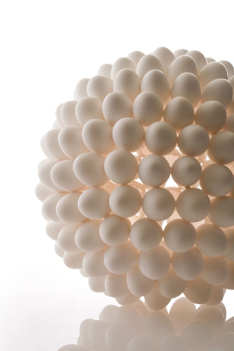 鸡蛋壳作为一种材料,很容易破损。但你可以把鸡蛋壳粘连成一个大的结构体。做成之后,你会发现这个结构体就像是原本就存在着的,自成一体,并且外观非常漂亮。