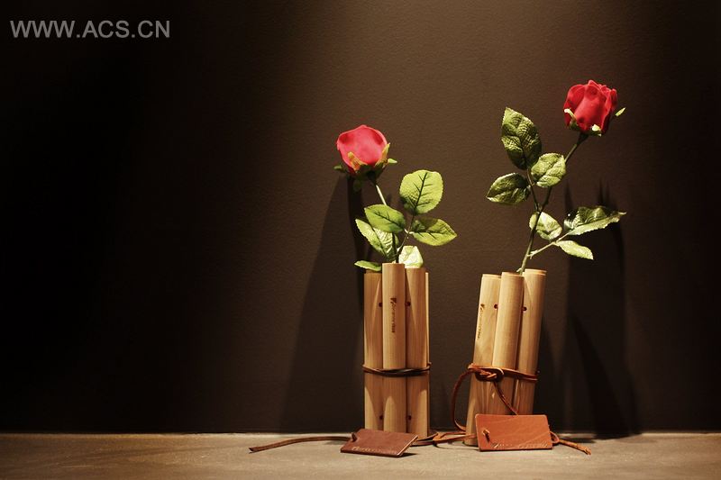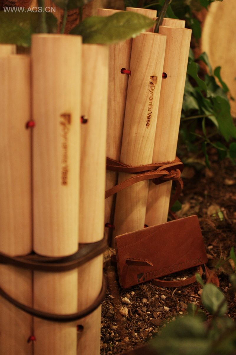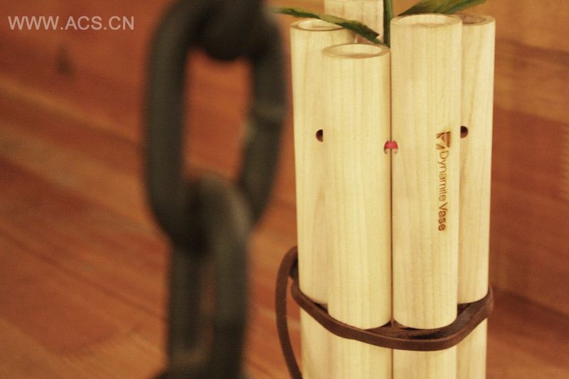 诺贝尔发明的炸药是破坏和平的致命性武器。但是,炸药发明的最终目的是为了结束战争,给世界战争爆发之后的世界带来和平。花瓶是代表爱的关键词,炸药是代表战争和危险的关键词,“炸药花瓶”旨在表达二者的对立统一关系。“炸药花瓶“以白蜡木为材质,用皮革细绳将做好的“炸药”捆绑起来。