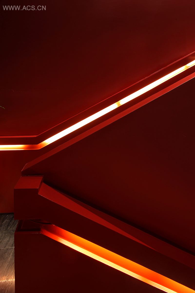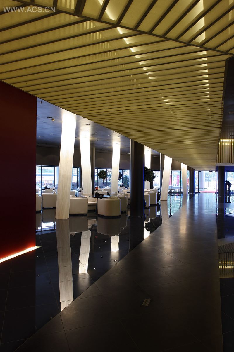 在这个空间里,各种几何元素既完美融合又各自独立,黑白红黄强烈的色彩对比碰撞出独特的空间感受。超大尺度的发光天花造型,以相对较低的标高,强化了交通空间,并分隔出不同的功能区域,同时也是整个销售中心重要的泛光源,塑造了柔和现代的空间基调。洽谈区白色发光斜立柱的设置,与原建筑黑色直立柱交相辉映,打破了空间沉闷气氛。