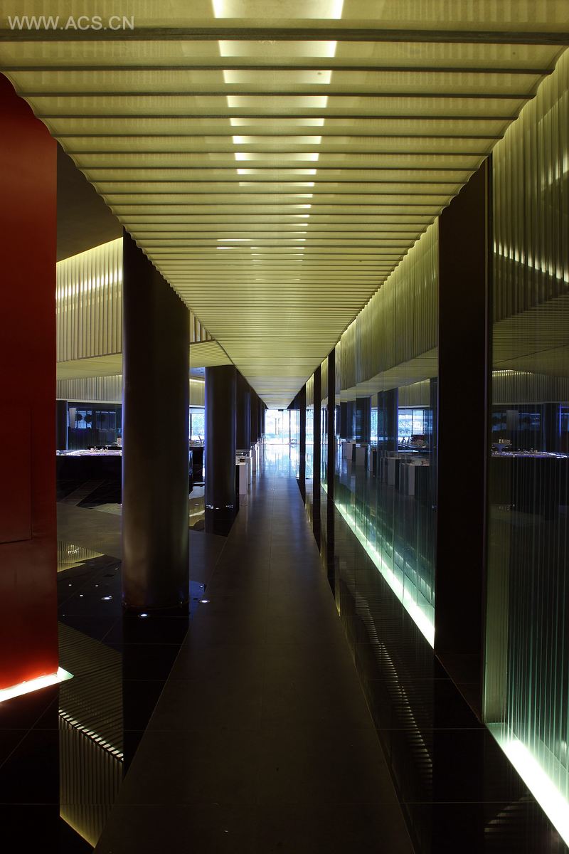 - 主要用材:阻燃金属砂、深灰色氟碳漆、暗红色氟碳漆、玻璃丝印图案、白色哑光砖、深灰色哑光砖、黑色高亮砖