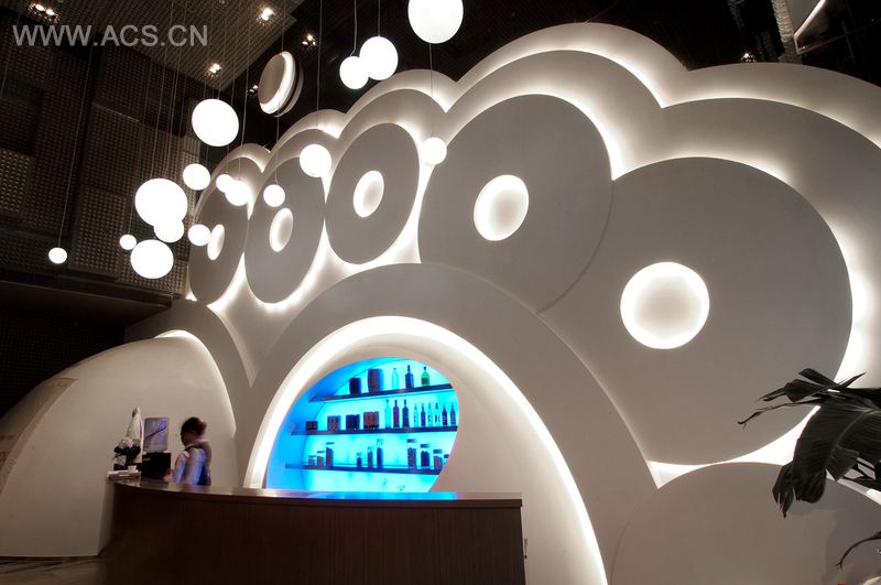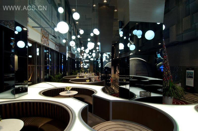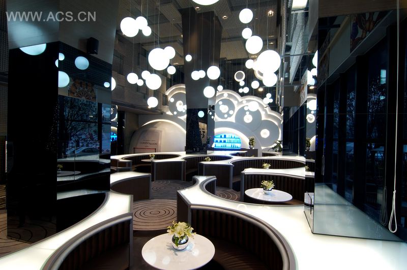 来到由13万个透明灯泡组成的二层高的洽谈大厅,瞬间视野豁然开朗,气势摄人震憾。整体的空间规划,设计师运用相同的设计元素,数个晶莹剔透的玻璃灯光做装饰材料,融入地整个空间的墙面和天花之中,使得整个行销展示空间像极水中的一群鱼在呼吸,大水面上浮起一个个晶莹剔透的汽泡,又好似繁星点点,照亮了整个苍穹。