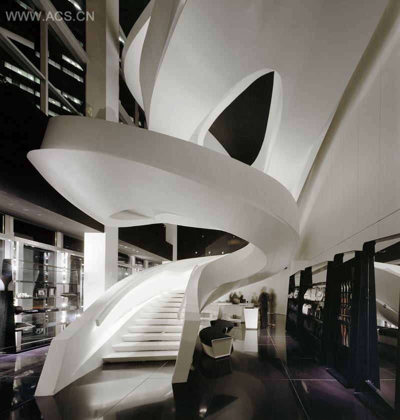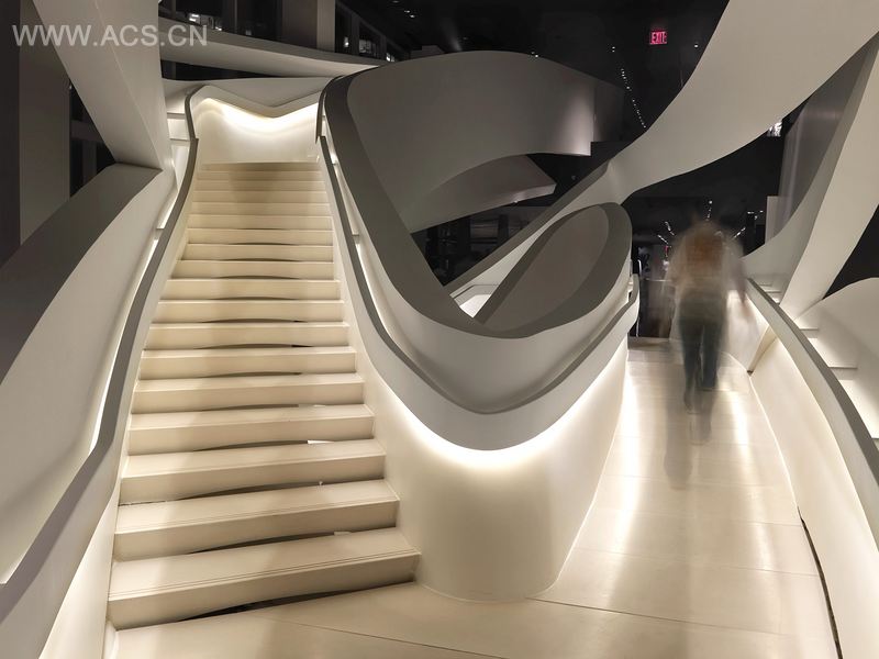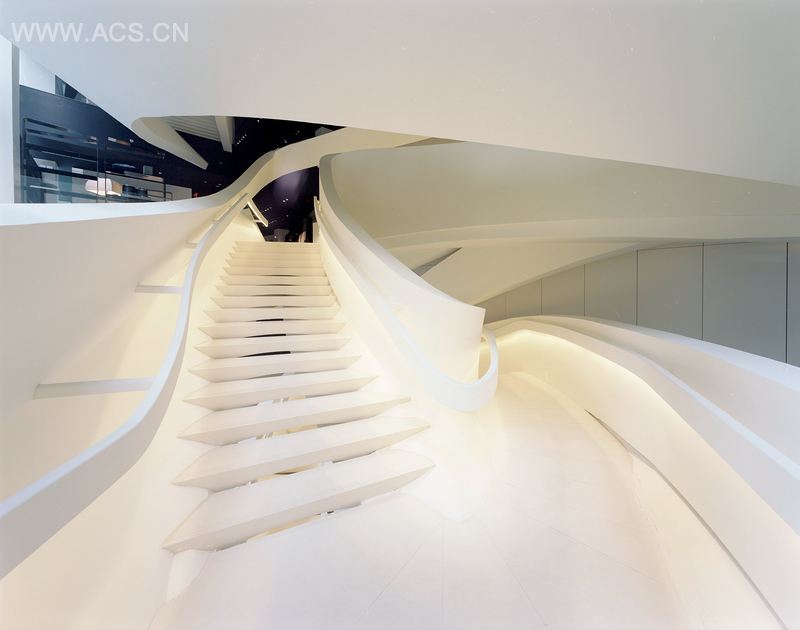 一层核心景观是连接各层之间的巨型钢质楼梯,同时这个钢质楼梯也是这个楼高四层的商店最突出的设计亮点。或许走进商店第一眼看到它,你会感到惊讶,因为这是一项前无先例的设计,独特的平缓曲度,再以相同的旋转往上,从垂直方向的表面绕行到上一层的楼梯。加之巨型楼梯在色彩上只选择了唯一的乳白色,这在视觉上必定会使行于其中的人产生愉快的空间感受。