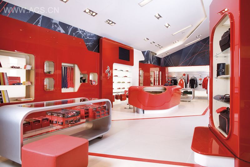 商店内的商品领域法拉利车迷区采用的是灵活性高的铝合金板条,豪华区的显示窗口使用柔软的拉丝皮革抛光漆材料,而在孩童区是通过综合黄漆的板条和显示窗口两种系统完成的。具体到每一个法拉利商店它的设计结构和图形样式都是紧密相连的。