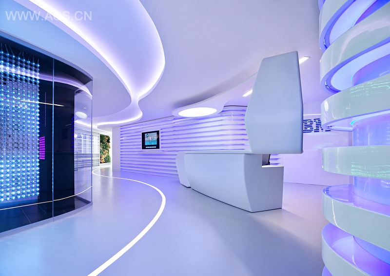 室内的颜色调配非常简单,分组的平行线状的背景墙给人视觉带来干练简洁的印象,而它的灯光效果是通过提供不同的音律般的前奏而使人产生赏心悦目的感受,而这些神游者的向导就是那一条单一的背光线,这个横跨的背光线设计既突出又大胆。调色板偏向静雅,不过值得一提的是,室内空间里的明暗变化是通过分布室内各处的照明元素创造形成的,但是整个能源灯具的摆放还是遵循了一定的规律,从而带给人谨然而有条理的空间视野,就像这个设计的雇主所代表的IBM品牌本身的企业特点一样。