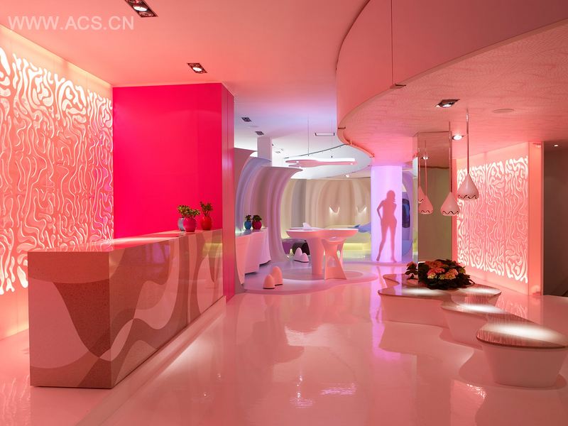 Karim Rashid是个喜爱明艳的粉色和纯洁的白色的男人,这不仅体现在他的衣着上,在他具体的设计中也时时印证着这一点,那是他最具代表性的颜色。“Smart-ologic Corian® Living”设计选取的材料和匹配的照明在视觉上都是粉色和白色的搭配,看起来五彩缤纷,带给人温暖且惬意的视觉感受。Karim Rashid使用了一种DuPont™ Corian® 板来设计这座住宅,中世纪的欧洲便是如此,只用一种平板就能建成一座住宅。DuPont™ Corian®板是一种双层板,其中一层是DuPont™ Energain® 板,它是一种全新的DuPont 材料,能增强能量效应和舒适性。板块搭建的系统可以随时改装成其它形状,而且板块的色调也有很多选择性,在这其中,他还设计了名为EKO的长凳,那是一种外观独特的室内座凳,凳子的部分曲线面上种植了一些绿色的植物,同时,他还是使用DuPont™ Zodiaq® 这种材料来设计座位区,让这个区的颜色十分丰富,像是将有机体的有机元素混合在一起。