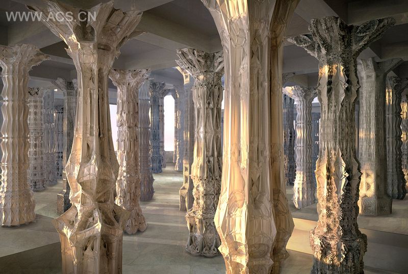 这是Michael Hansmeyer 参加韩国光州设计双年展的作品:第六秩序。主要的材料是厚1毫米的ABS塑料,共使用了108, 000张。这个作品不是为了展示设计的最终对象,而是为了展示生成对象的过程。进入展览室,参观者首先看到的是16根柱子。这种效果是在相邻在两面墙上都使用落地镜而产生的,实际上只用了四根柱子。